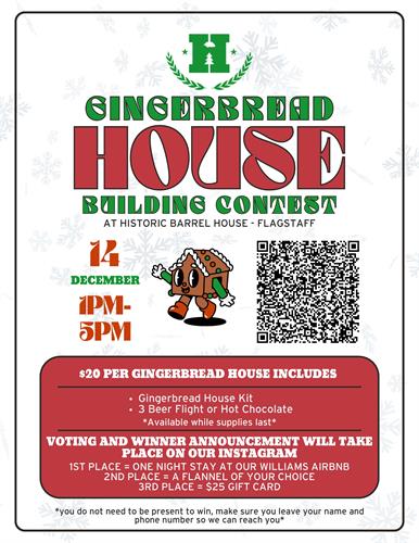 For $20 per Gingerbread House Kit, you will receive all the supplies you will need, and a three-beer flight or hot chocolate while supplies last! Limited seats available for children and parents!